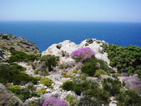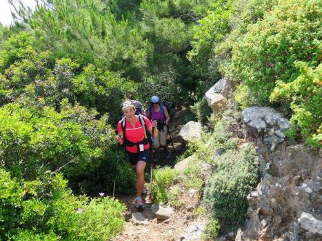 Seguimos nuestro camino hacia el norte por el sendero que se suele esconder entre los arbustos espinosos típicos de la isla y los pinos o rocas calcáreas, hasta que a veces llega a perderse. Ante nuestros ojos se abren impresionantes vistas hacia el mar y sus calas escondidas de aguas transparentes que despiertan en nosotros ganas de bajar volando para refrescarnos en ellas.