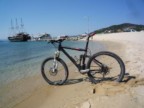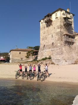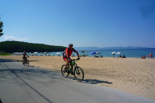 Si pedala sul lungo arco di costa sulle spiagge d’ Asprovalta e Stavròs.Si entra per ca. 30km. sulla statale non molto trafficata che costeggia la penisola Calcidica e porta a Ouranopoli (ultimo posto abitato prima della frontiera con i monasteri del Monte Athos).