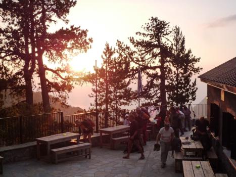 Ci fermiamo al rifugio per la cena e il pernottamento, sperando d’assistere a un bel tramonto sulle cime dell’Olimpo.